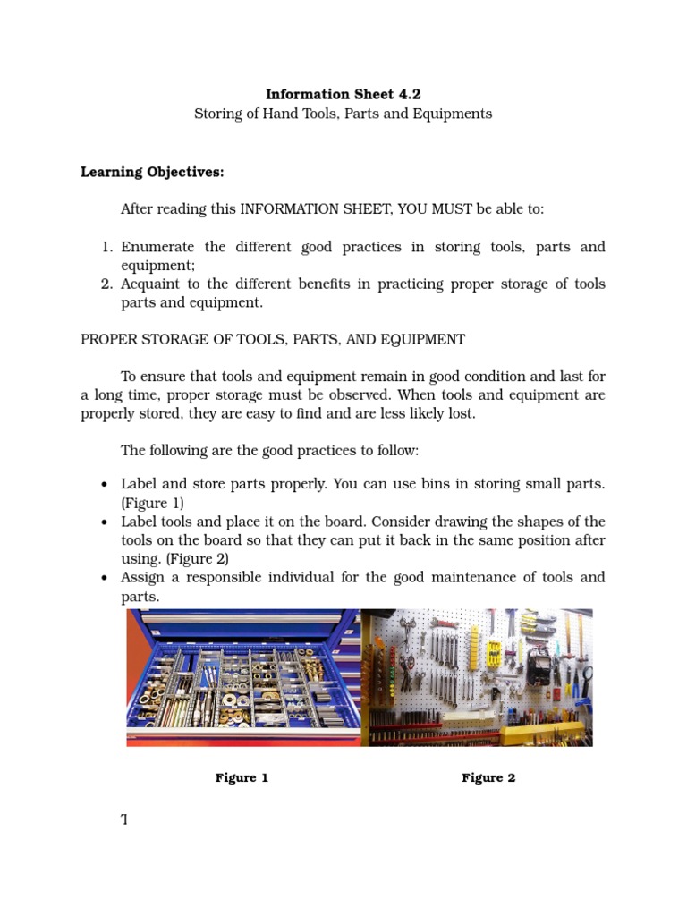 Don't work with oily or greasy hands. It is an important factor for safety and health as well as good business. Additional recommendations for cylinder storage inside a shed or other ignition sources (e.g., open flames, electrical equipment, or heating equipment) should not be allowed within the storage facility. Proper care and routine maintenance of your hand tools and power tools makes any home improvement or repair project easier, safer and make it a habit to clean tools after each use before you return them to storage.